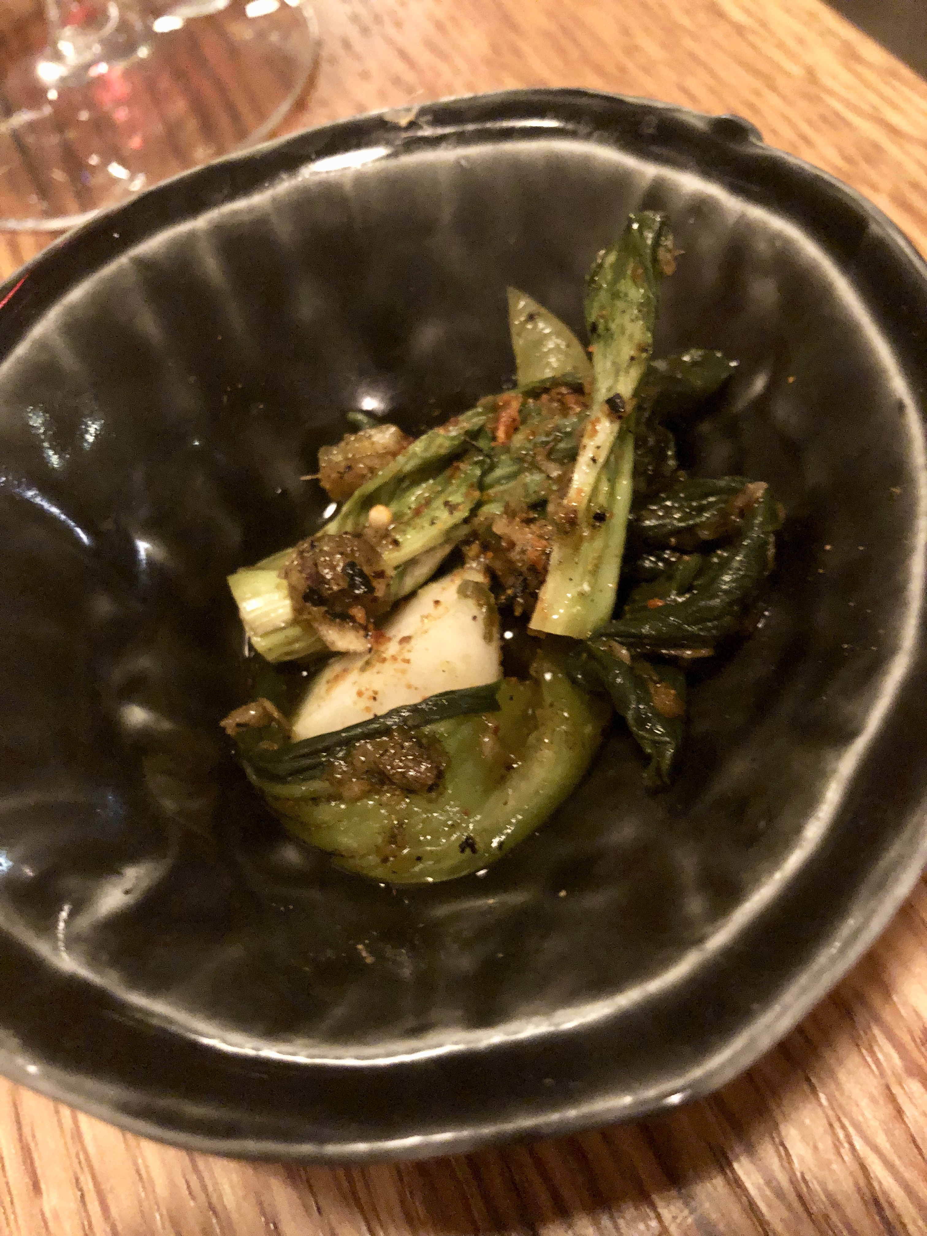 3rd course: Grilled cod with green curry which wasn’t very curry like…..had a hint of lime but no spiciness. Very light dish which arrived with a side of potatoes that added good texture. This was my least favorite dish…..good but not great…..very subtle flavors and it was not what I expected. Arrived with a side of vegetable kimchi in a fish sauce vinaigrette. As advertised…Kimchi.