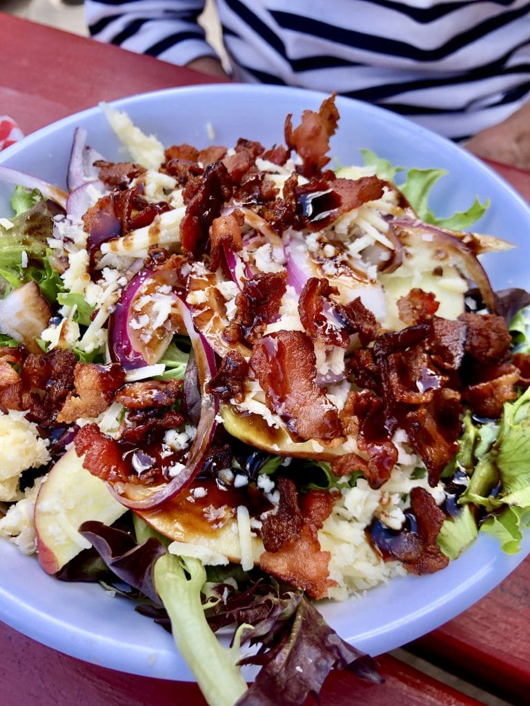 It’s a typical bar…with plenty of bikers….the other kind, and beer. Food choices are also typical but with a bit of a twist including fried pickles, hummus, a kale salad and for dessert, a salted caramel brownie. Otherwise it’s a burger and beer kind of place with large food servings and limited wines.