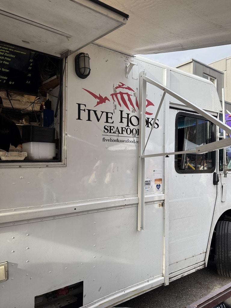 Food truck offering seafood to go. The fish (cod) was deep fried but 2 things made the flavors wonderful: first the planko and second was the tartar sauce. Not sure I’ve ever had better. Tart but with a slight sweetness. Perfect with the fish. Make sure you get an extra one since you’ll need 2 because it’s so tasty.