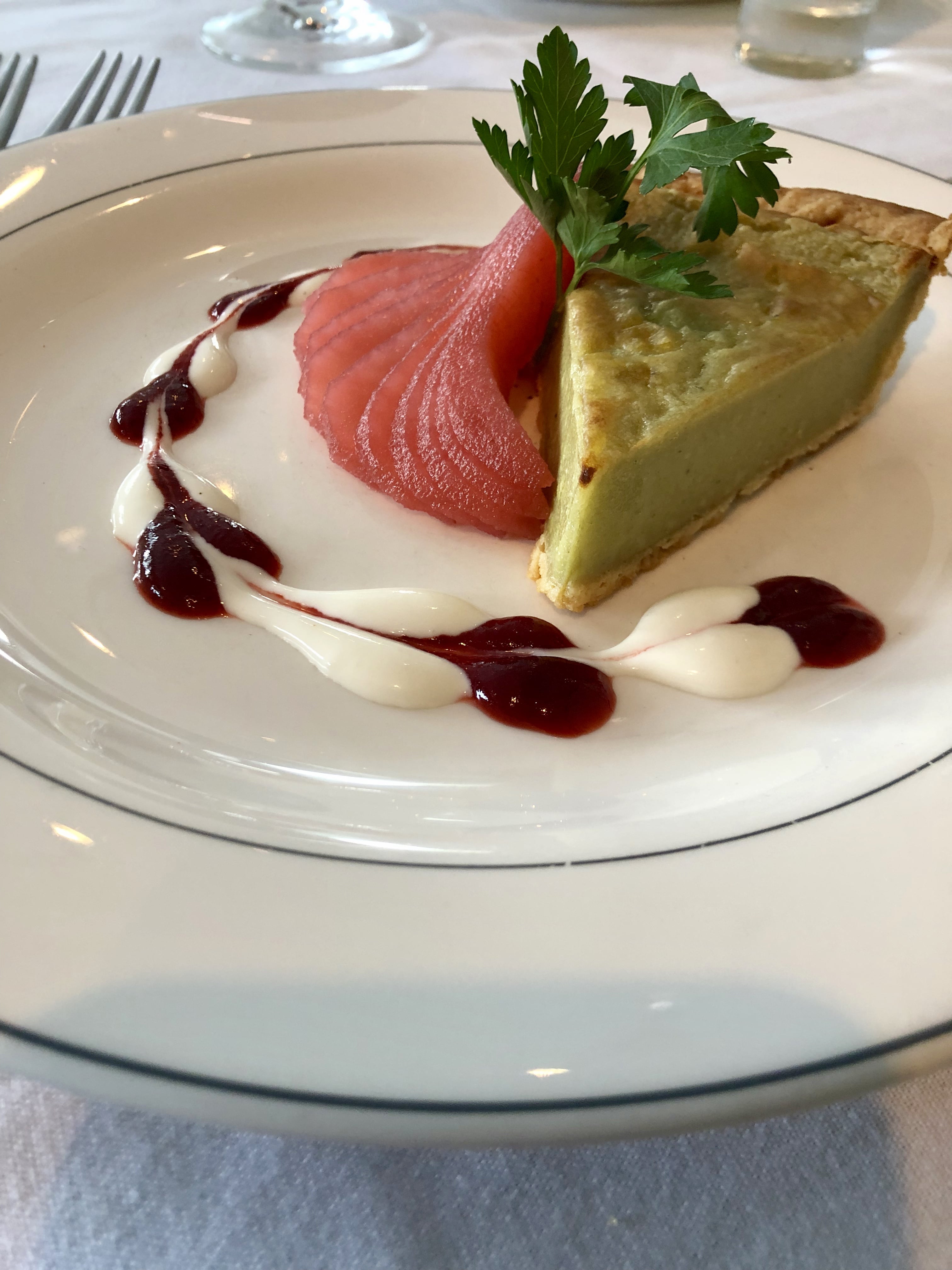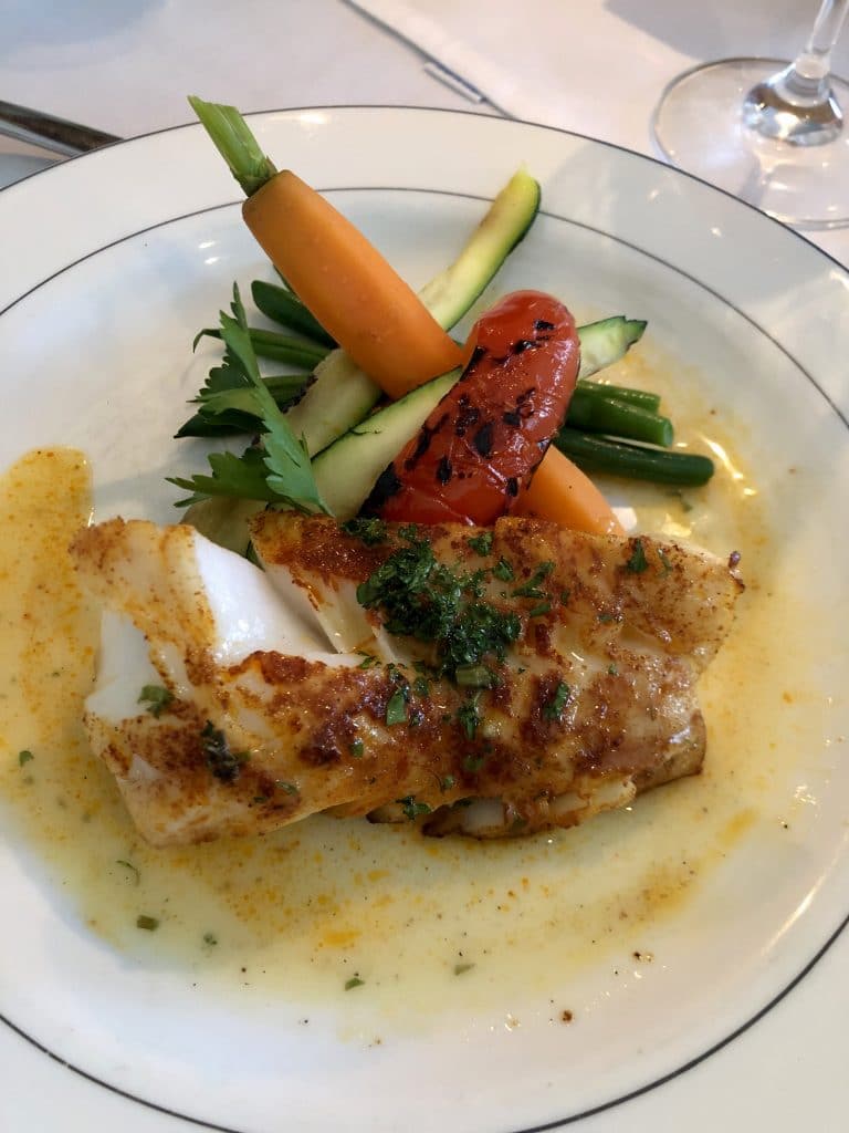 Next up were the mains: Sablefish meuniére, grilled salmon and the venison with juniper and lingonberry demi-glacé which was my choice. It was perfectly cooked and the sauce rich and flavorful. Salt was needed for the accompanying potatoes which were woefully in need of it which I rarely add but had to in this case. The salmon was fresh from the Pacific and perfectly grilled. The sablefish was good but the salmon, better. Then again, I’m partial to wild Pacific salmon.