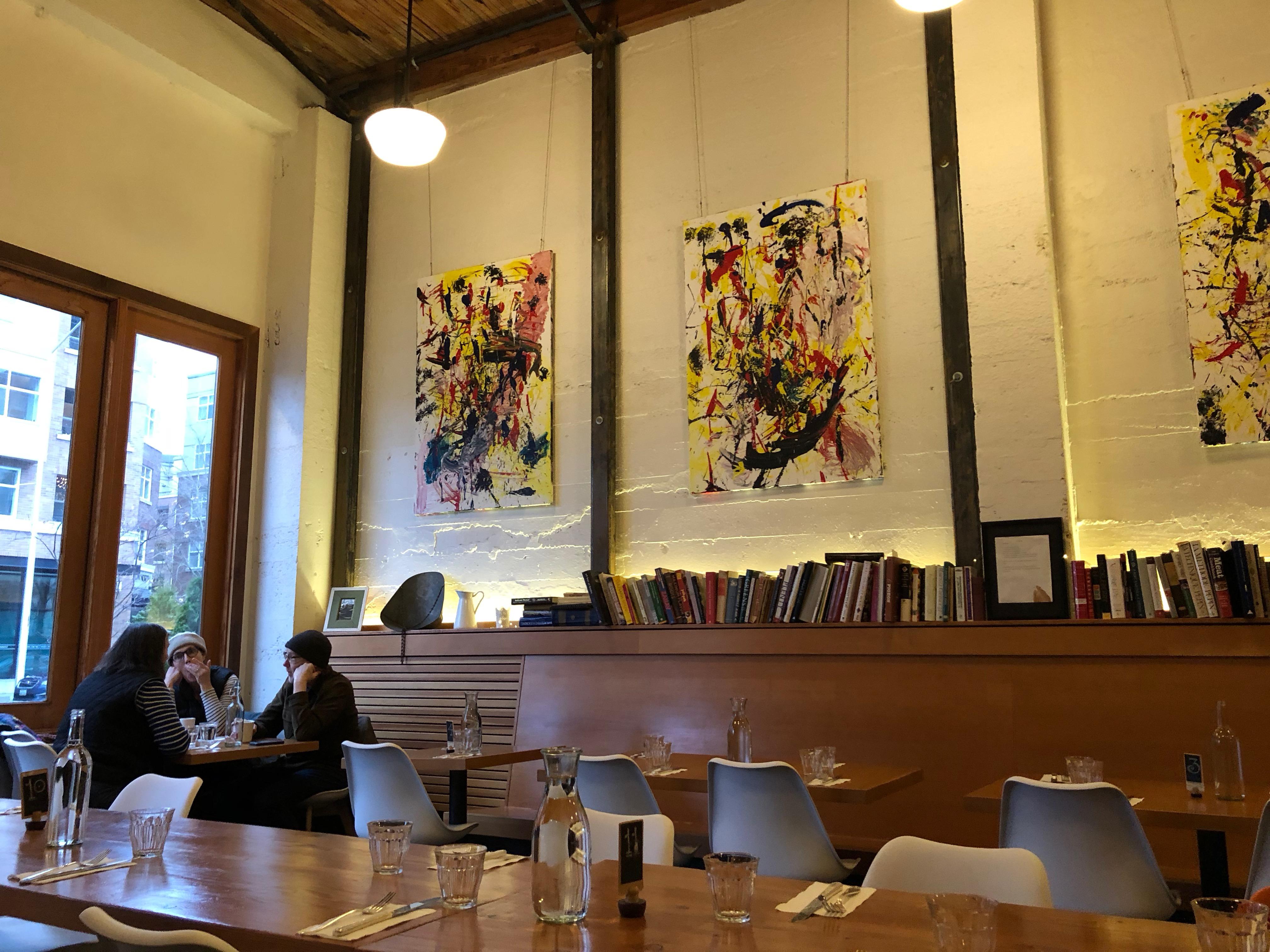 The menu is varied and the choice this visit, in addition to biscuits and grits as sides, was the pork belly hash. In addition to the pork belly and potato hash the dish was served with small slices of pear, yams, Brussels sprouts and a tarragon salsa verde. To add a bit of richness it was topped with a poached egg. I’m no expert in poaching eggs…..never done it as far as I can recall….these are poached at 65 degrees C for one hour. They were quite creamy but I would have to compare them to another method to truly tell any difference. While biscuits are on the menu, they are not prominent, but they were very good so have one…..or 2 or more. The space is open and lofty which I think had something to do with the food being served a bit less than hot (think tepid) on this relatively cold day.