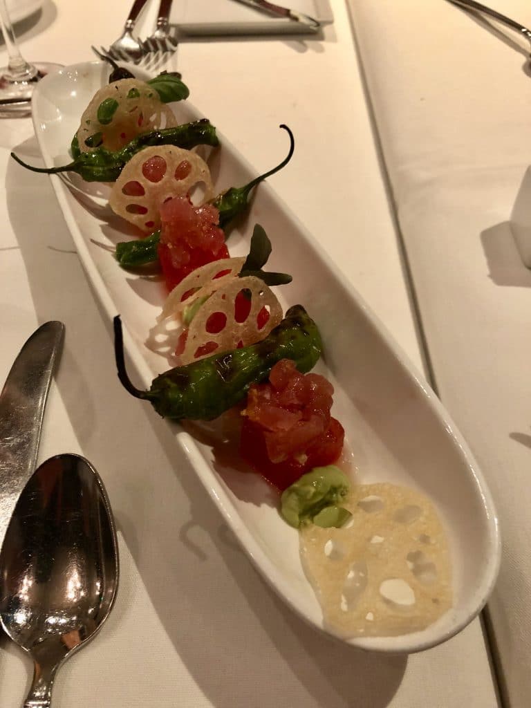 We started with several appetizers which included the beet salad, Rioja “Picnic” (charcuterie plate), tuna tartare, and the BBQ peach flatbread. My nod goes to the “Picnic”….not only was it delicious, it was a presentation masterpiece. Second place goes to the tuna…..interesting combination of tuna, watermelon, shishito peppers, avocado and lime panko.