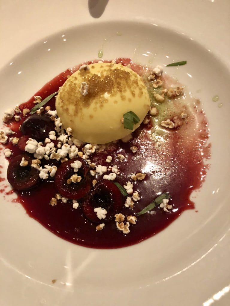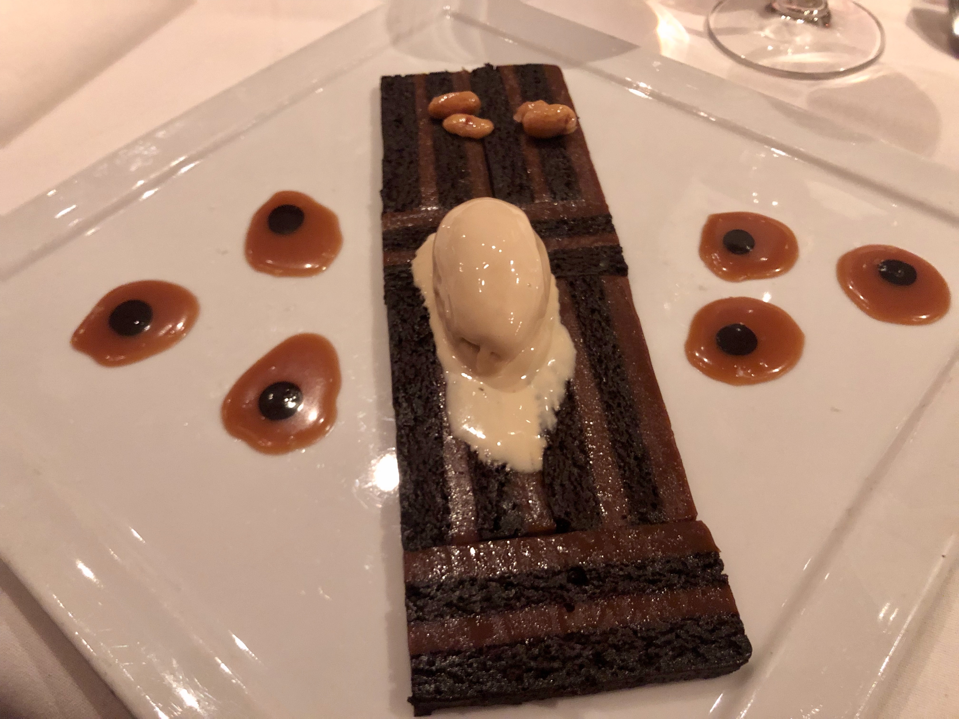 Next we were onto dessert….again no disappointments with more presentation masterpieces…..the blue cheesecake mousse in particular. It arrived topped with crispy chocolate angel hair….delicate and seaweed like in appearance. But, that wasn’t my choice…once again I’m boring….my choice was the chocolate peanut butter torte. A masterpiece as well….and I have no idea how it could have been sliced so thinly. Absolutely scrumptious. Since we were on a roll I had to finish the night with a dessert wine. There were a number of very nice selections and my choice was the Inniskillin ice wine. As expected for this Canadian producer known for ice wines; quite nice indeed.