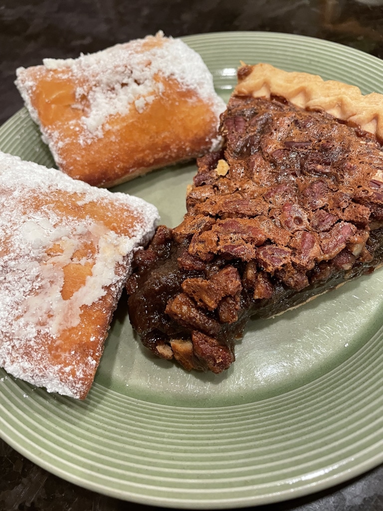 Our experience didn’t disappoint. The menu ranges from shrimp and oyster Po’ Boys to shrimp and grits with a host of choices in between. Couldn’t decide so we had a smorgasbord which included the gumbo followed by the fried oyster Po’ Boy and shrimp and grits. Sides included the coleslaw and of course I had to try the cornbread…slightly sweet. For dessert…beignets and pecan pie.